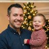 My dad in a jacket with an emblem, my dad holding me on his shoulders, my dad kissing my mum in front of our Christmas tree.