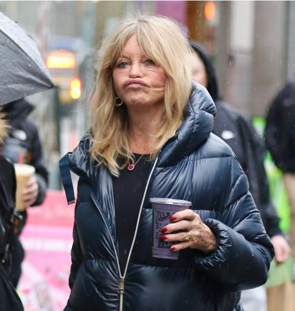 A botched facelift has radically altered the appearance of 77-year-old Goldie Hawn