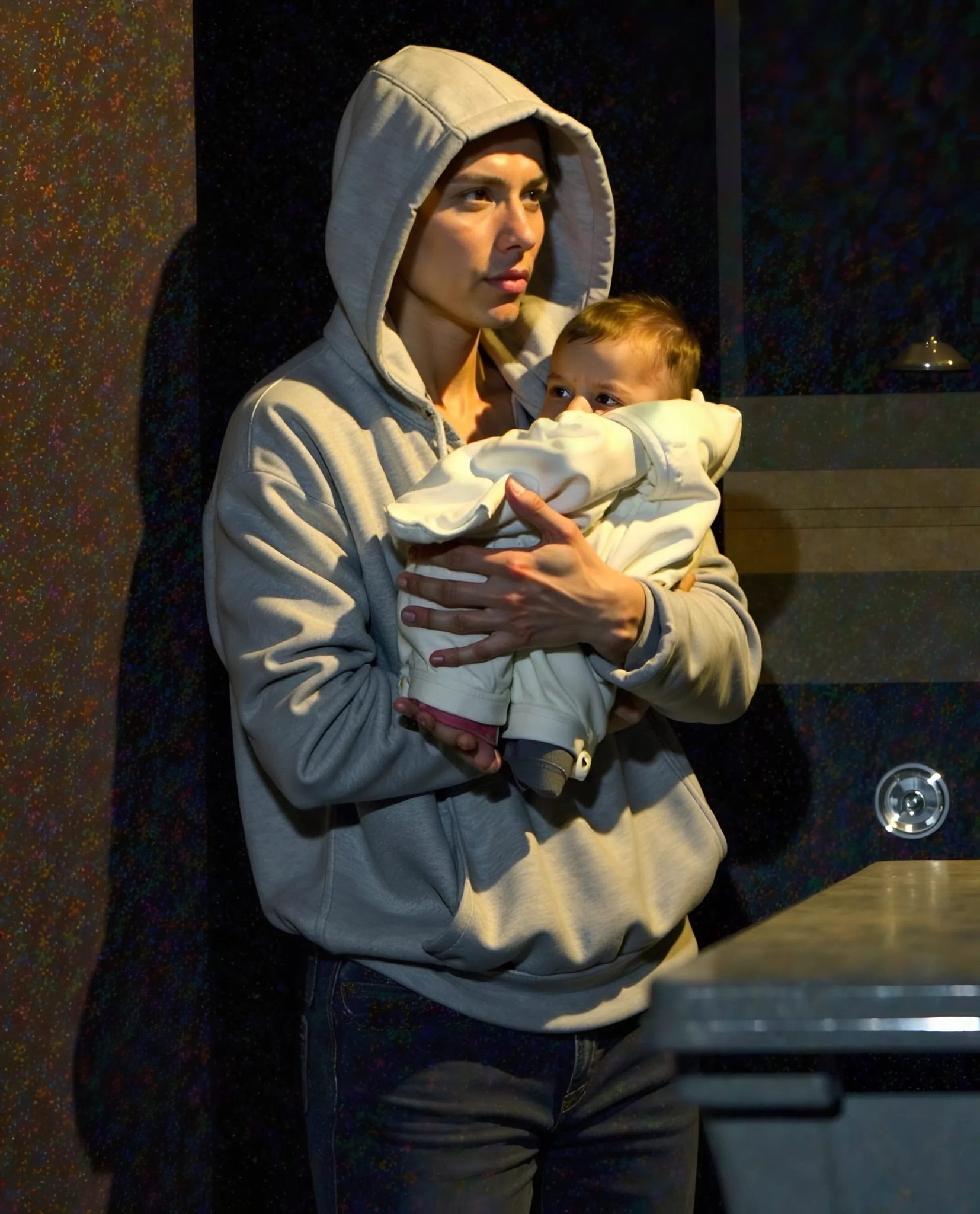 A teenage girl, maybe 16 or 17, with a hoodie pulled tight and tears streaming down her face. In her arms was a newborn, red-faced and wailing like the world had already broken its promise to him.