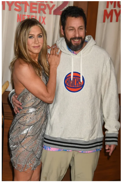 In one of the photos, Aniston posed with her co-star Adam Sandler, who played her partner on screen. Internet users were amazed by her choice of outfit, which barely concealed the actress’s figure.