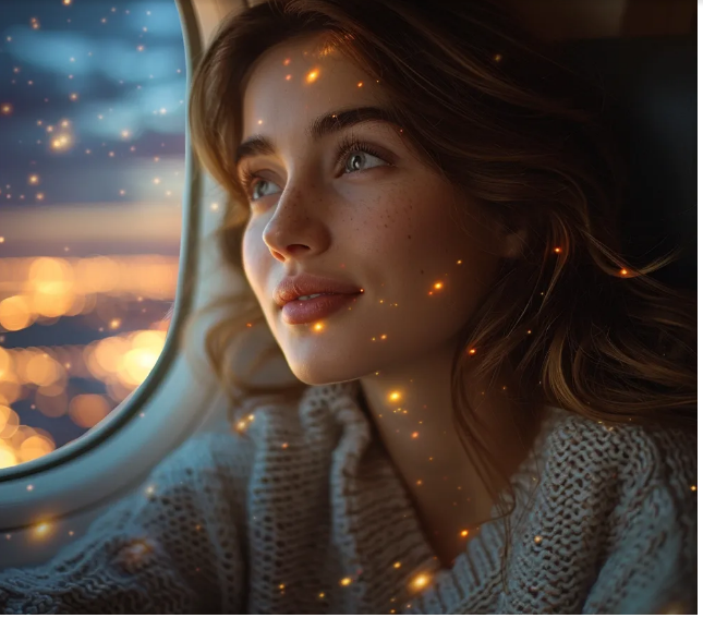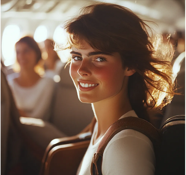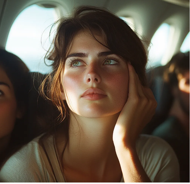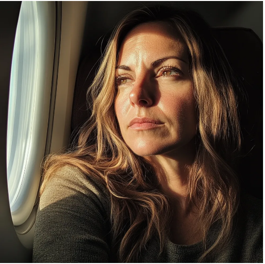 Rachel remained still in seat 9A—dark hair loosely falling around her face, part of it tucked into the collar of her worn charcoal hoodie. Her thin-framed glasses sat low on her nose. One hand rested lightly on a faded fabric bag that looked like it had seen years of use.