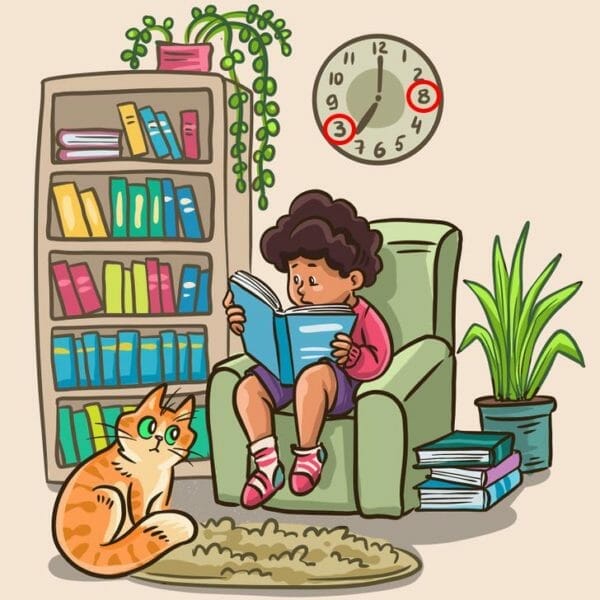You see a boy sitting peacefully, reading a book, with a cute cat cozily snuggled up next to him. But… something isn’t quite right. Your mission? Find the mistake hidden in the picture!