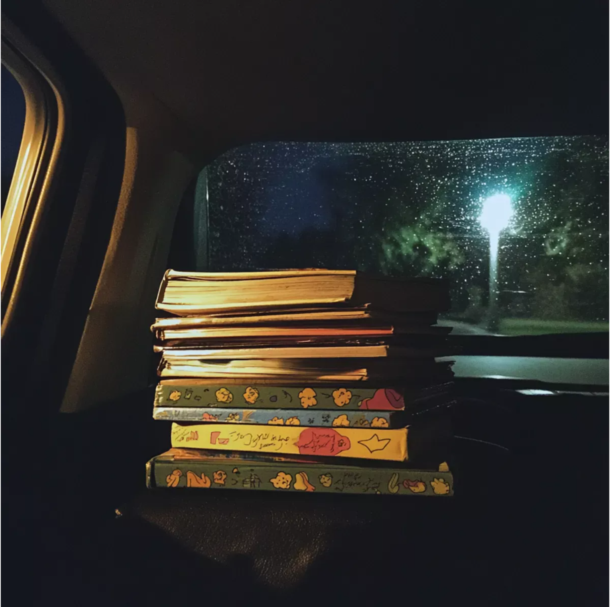 He looked at me, then reached into the back seat, pulling out a small stack of books and a recording device.