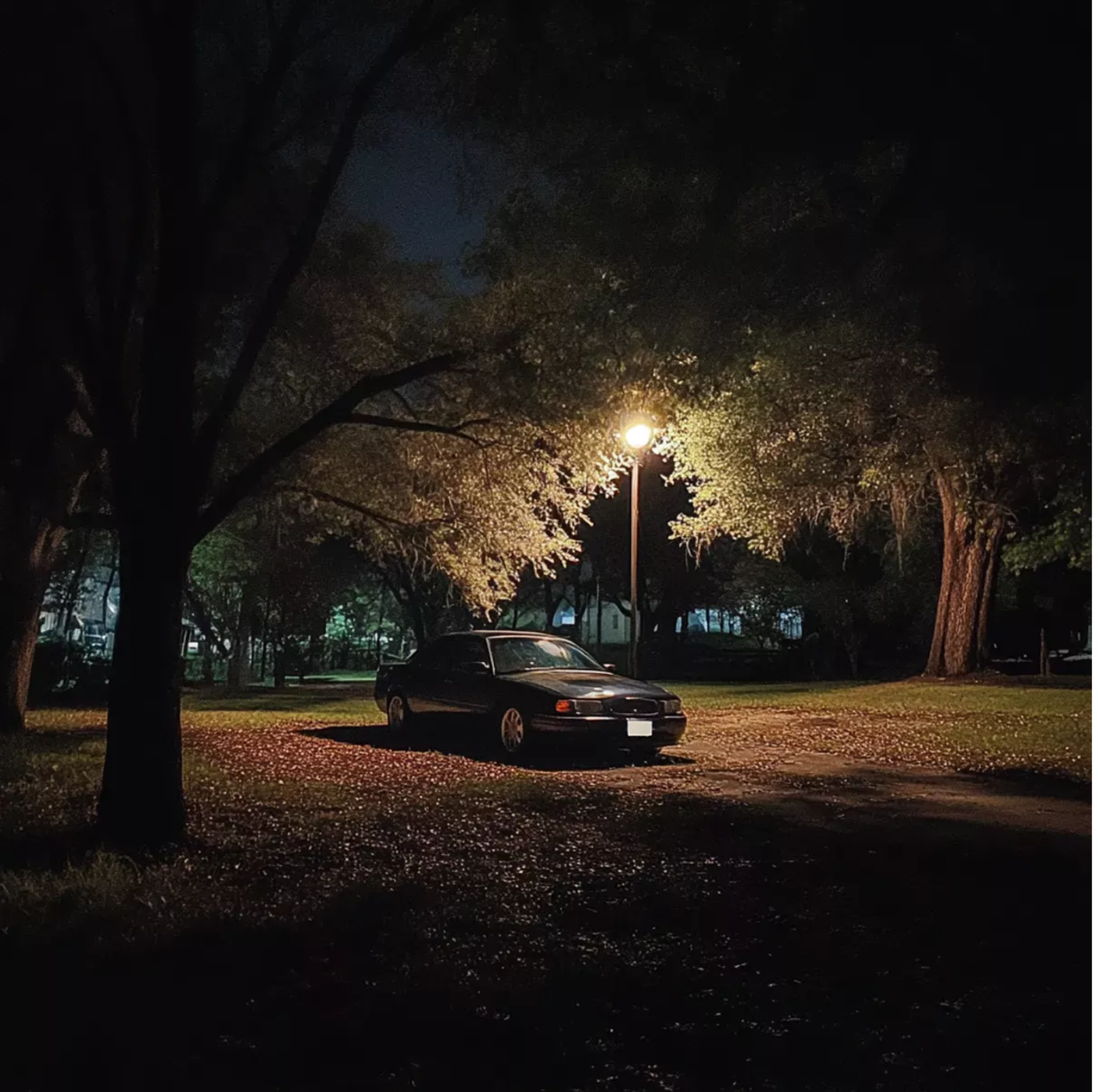He didn’t go far. Just to the local park, where he stopped under a tree and turned off his headlights.