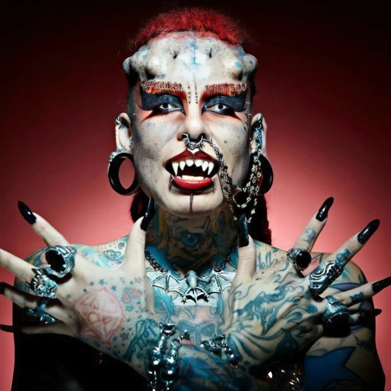 Her entire body is covered in tattoos, and she has implants on her face, because she considers herself a vampire: her appearance previously