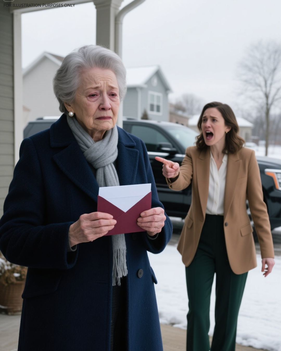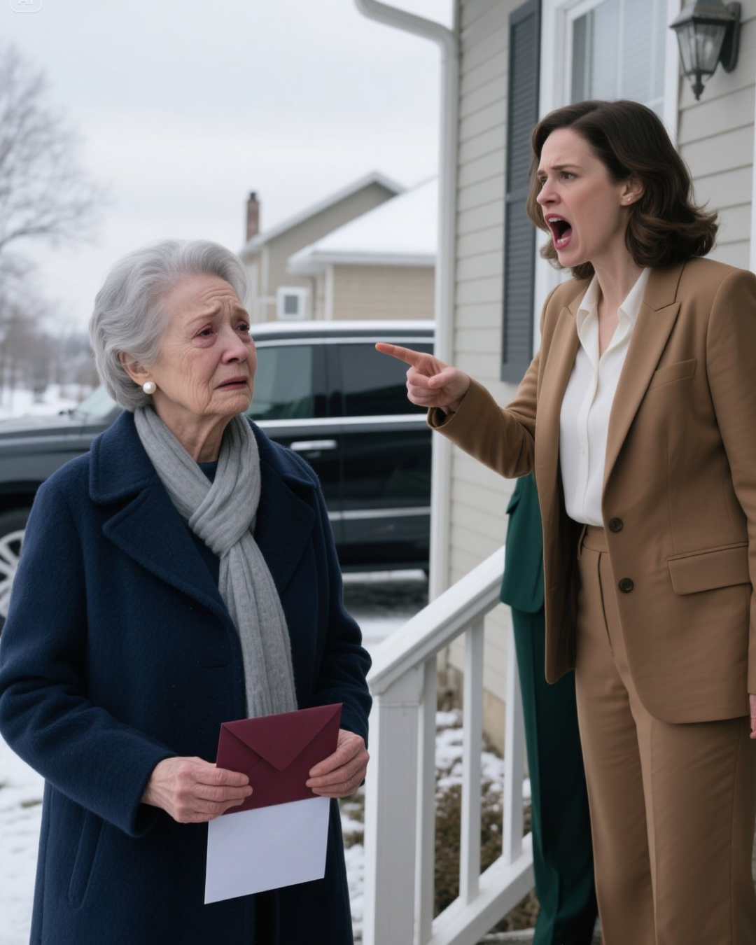His voice was sharp, burning. I stood there frozen, snow melting on my shoulders.