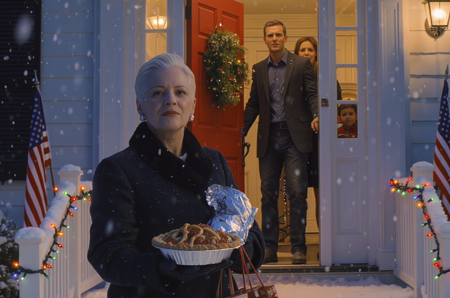 I stood there in the snow with the pie in my hands, looking at the wreath on their door. Inside, I could hear Christmas music playing. Laughter. My grandchildren asking, ‘Daddy, who’s that?’