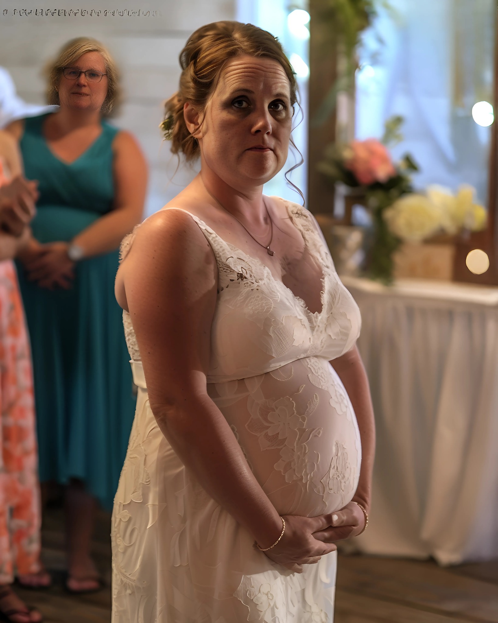 Before I could process the sensation, gravity seemed to conspire. A wrapped gift fell out from under her dress, landing with a thud that cut through the background music of the wedding.
