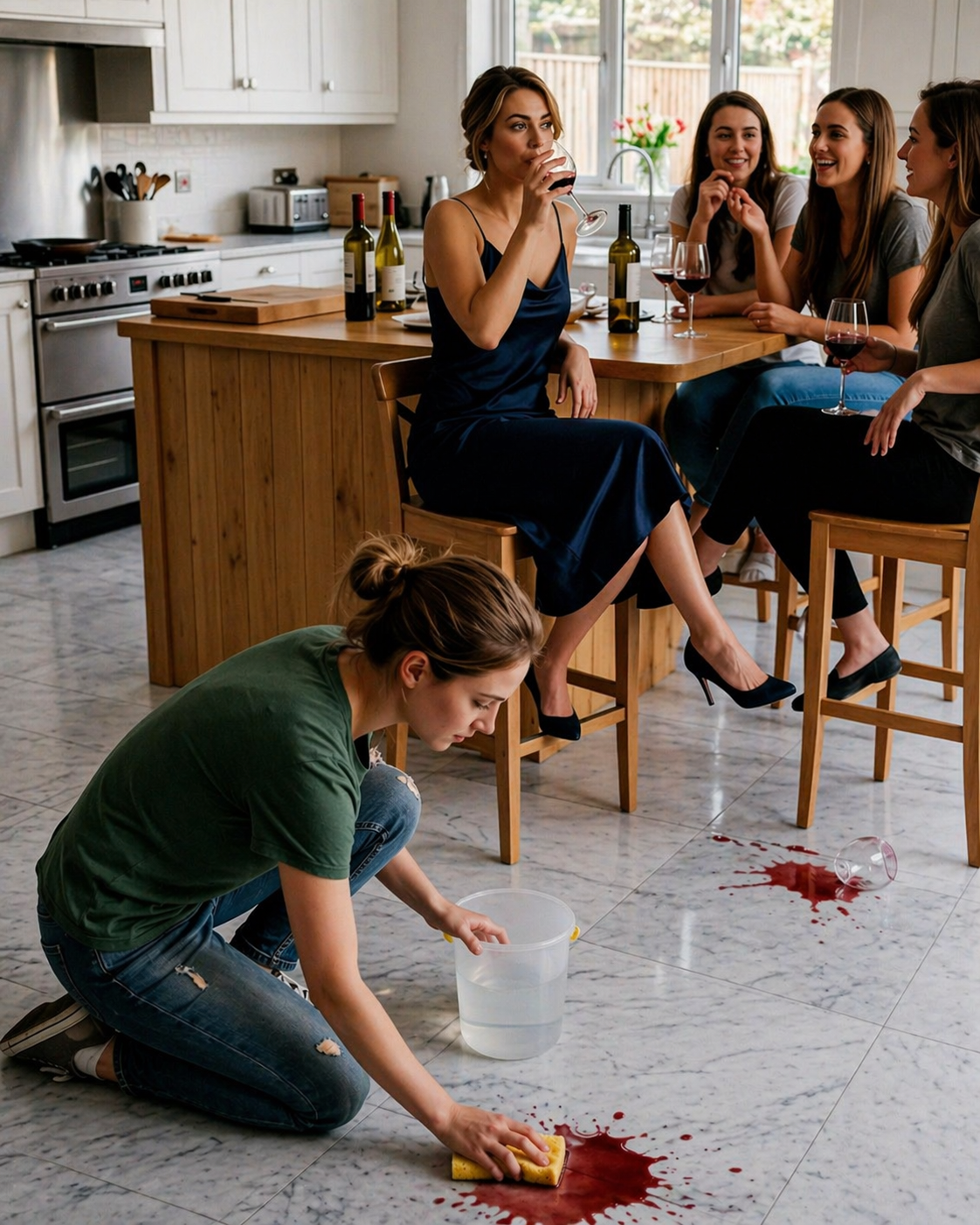 Maya was on her knees on the cold marble floor, scrubbing a dark stain with a soaked sponge.