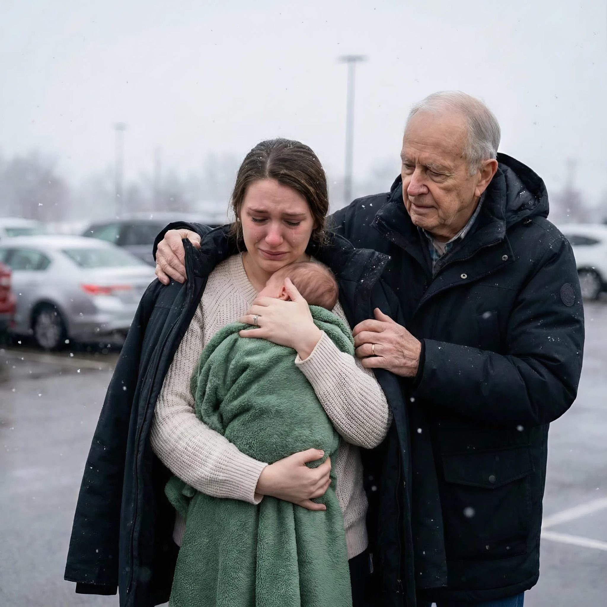 She stood near the far edge of the lot, partially hidden between parked cars. She was young, barely more than a girl, holding a baby wrapped in what looked like a thin bath towel. She wore only a light sweater—far too little for a winter afternoon like that.