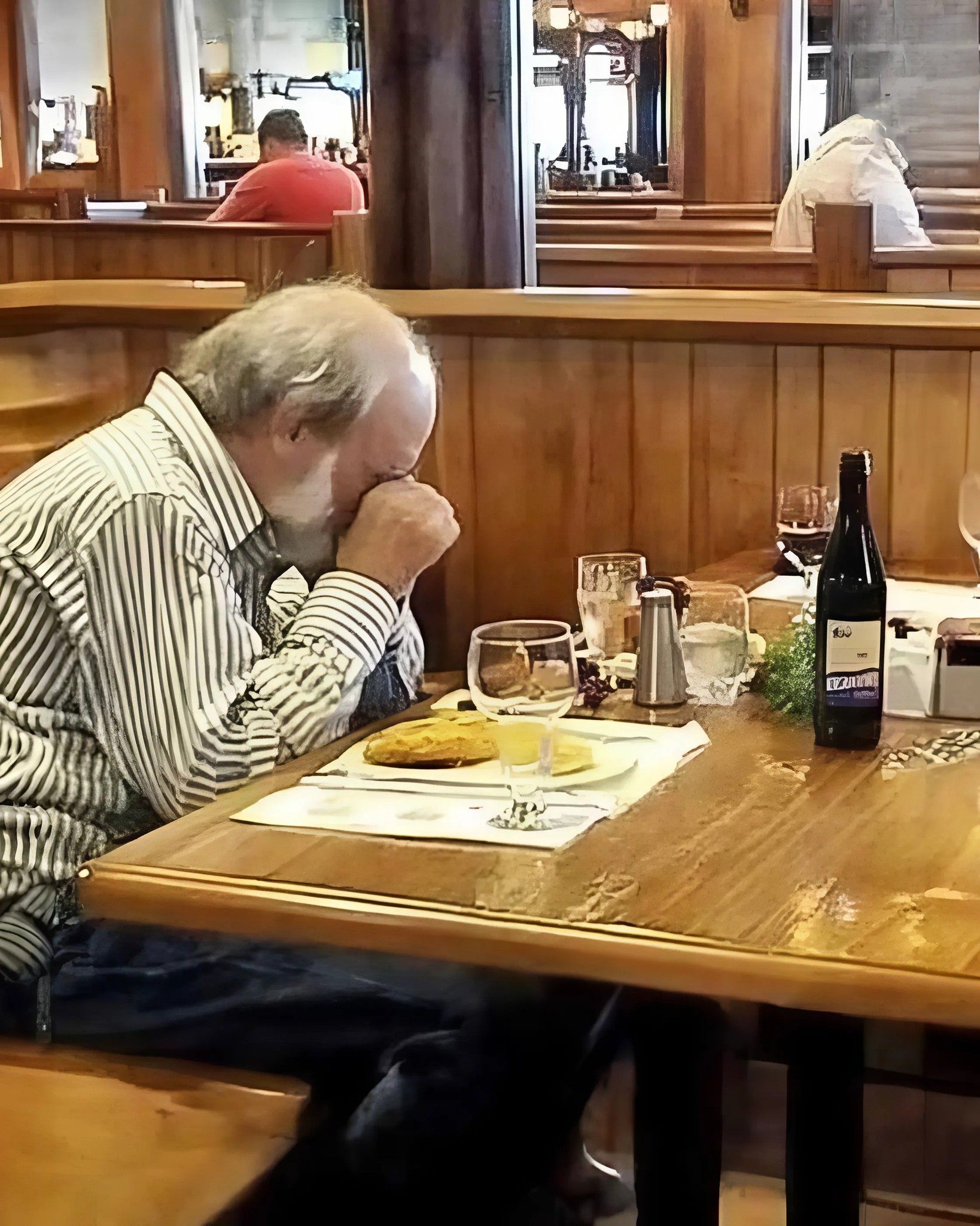 By that time, two plates had been brought in, steam rising gently from the dishes. But he didn’t look at them. His gaze was fixed on the empty chair opposite him, and his fingers slowly fiddled with the edge of his napkin.