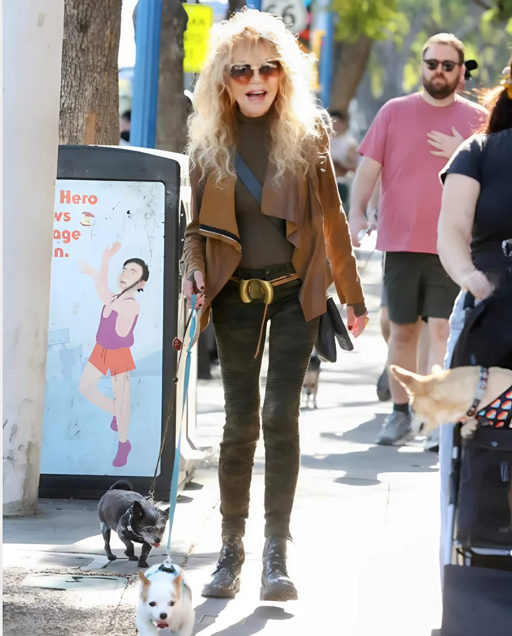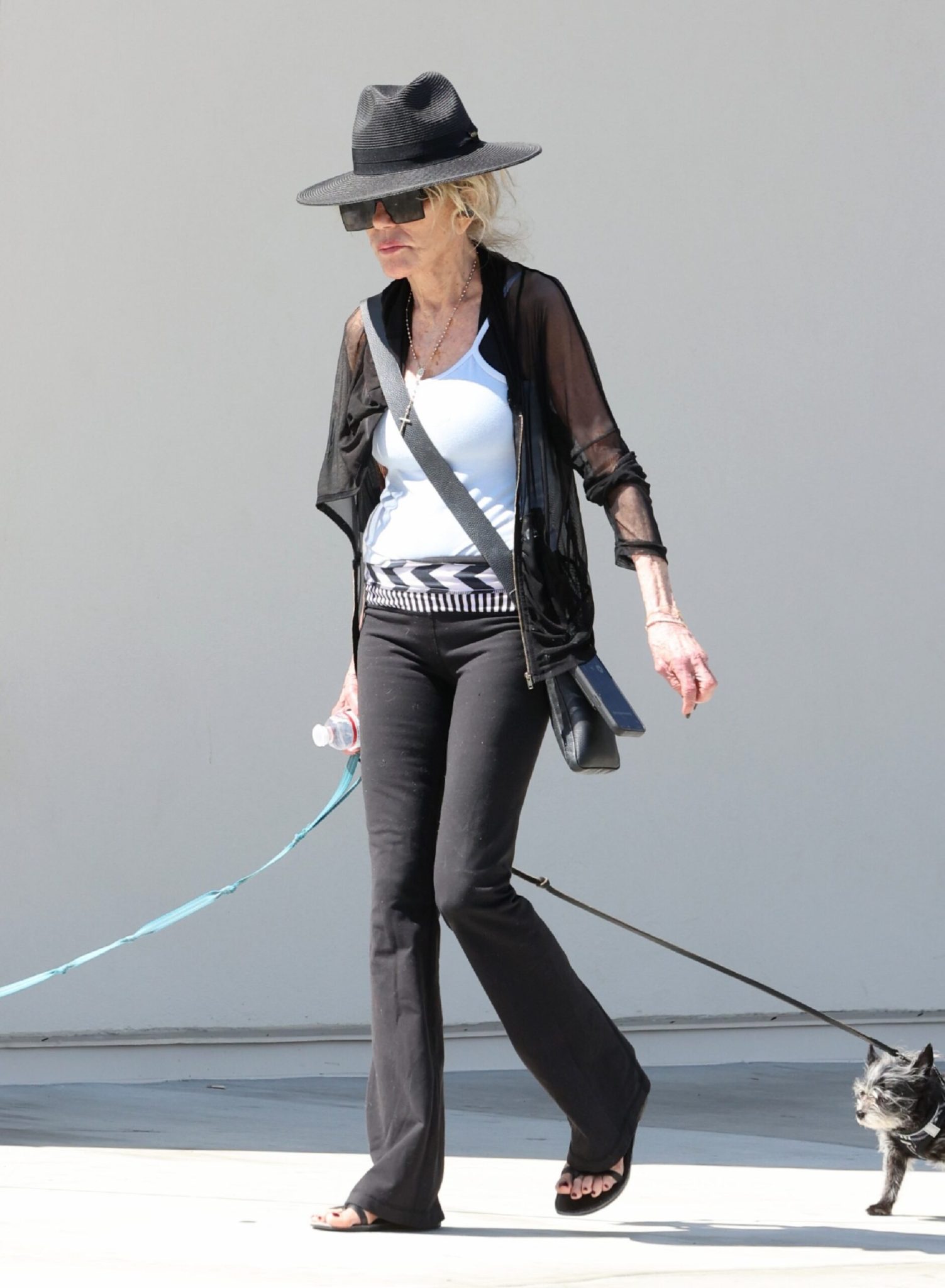 The 88-year-old actress and filmmaker was photographed in Los Angeles on July 13 while walking her dogs. She kept a relaxed look, wearing a white summer blouse, black flared leggings, a black fedora, and simple sandals.