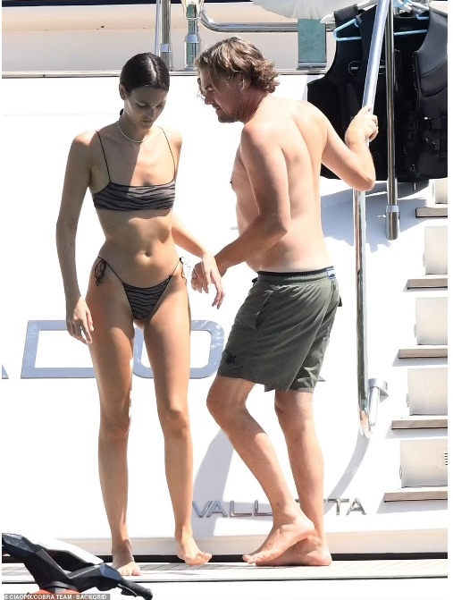 The 49-year-old Oscar-winning actor and the 26-year-old supermodel looked very much in love as they enjoyed their holiday together on the picturesque shores of Sardinia. Dressed in an army green swimsuit that showed off his toned physique, DiCaprio smiled as he relaxed on board a luxury yacht with his stunning partner. Vittoria turned heads in a revealing green bikini that showed off her toned figure as the couple enjoyed the Mediterranean lifestyle.