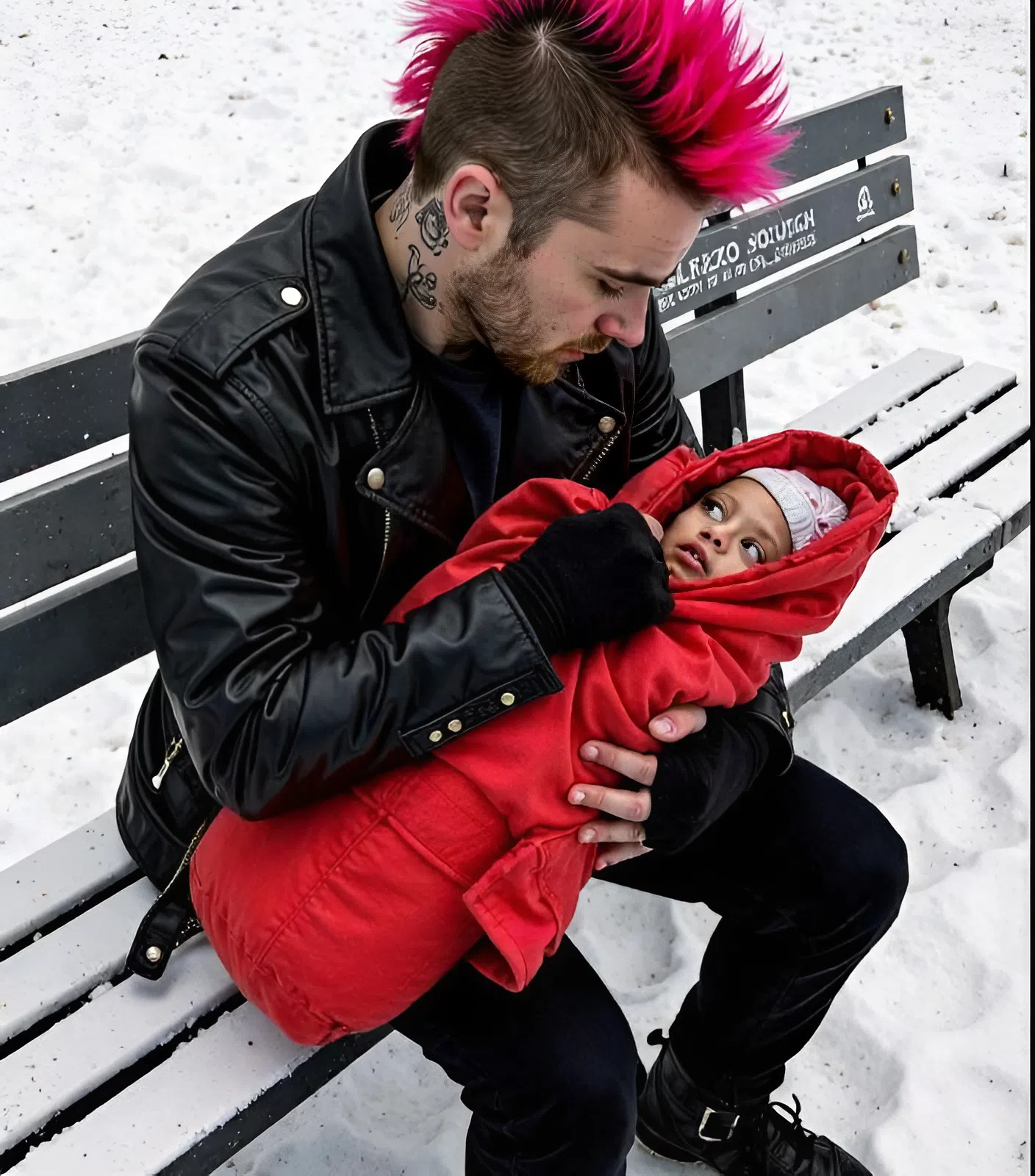 He pulled the baby closer, wrapping his leather jacket around them both. Underneath he had just a T-shirt.