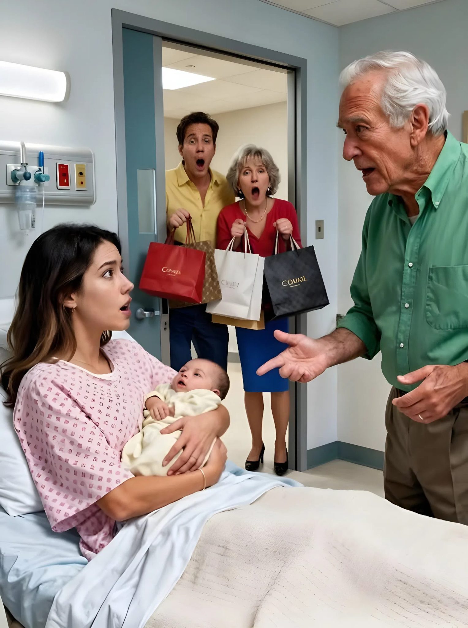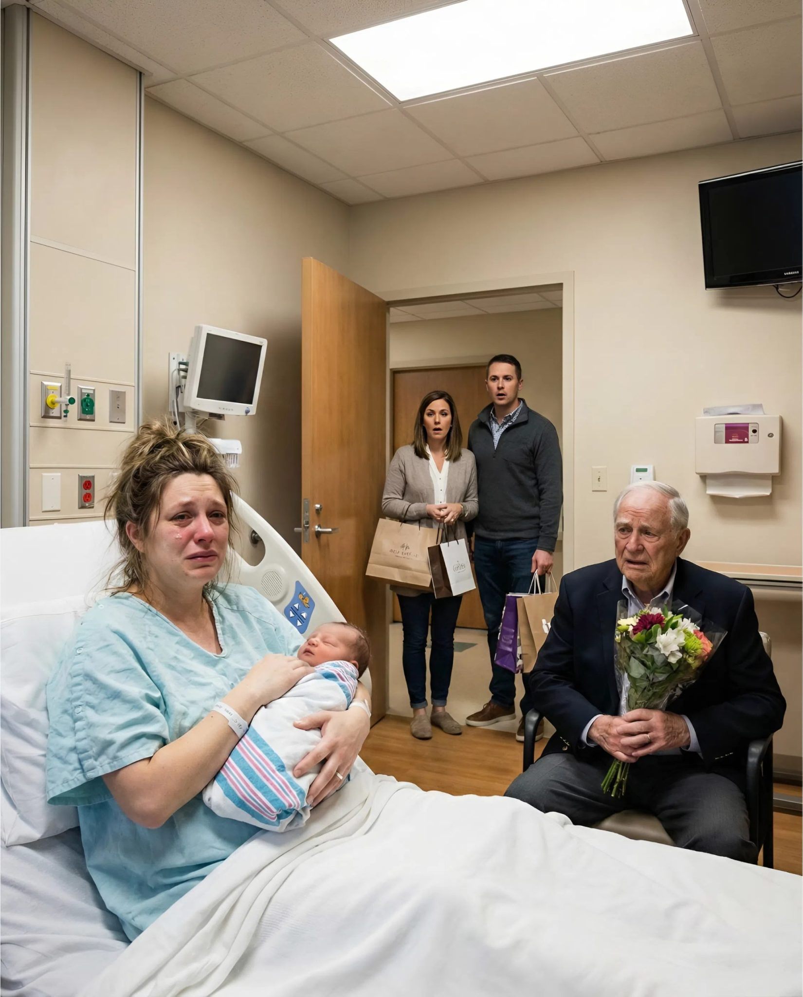 Then the moment turned almost cinematic. The door opened and in walked Mark—Claire’s husband—beside his mother, Vivian. They didn’t arrive with baby supplies or comfort. Instead, their arms were loaded with designer shopping bags. The contrast between luxury labels and Claire’s years of scraping by wasn’t just insulting—it was proof. Those bags weren’t symbols of success; they were physical evidence of a long-running theft.