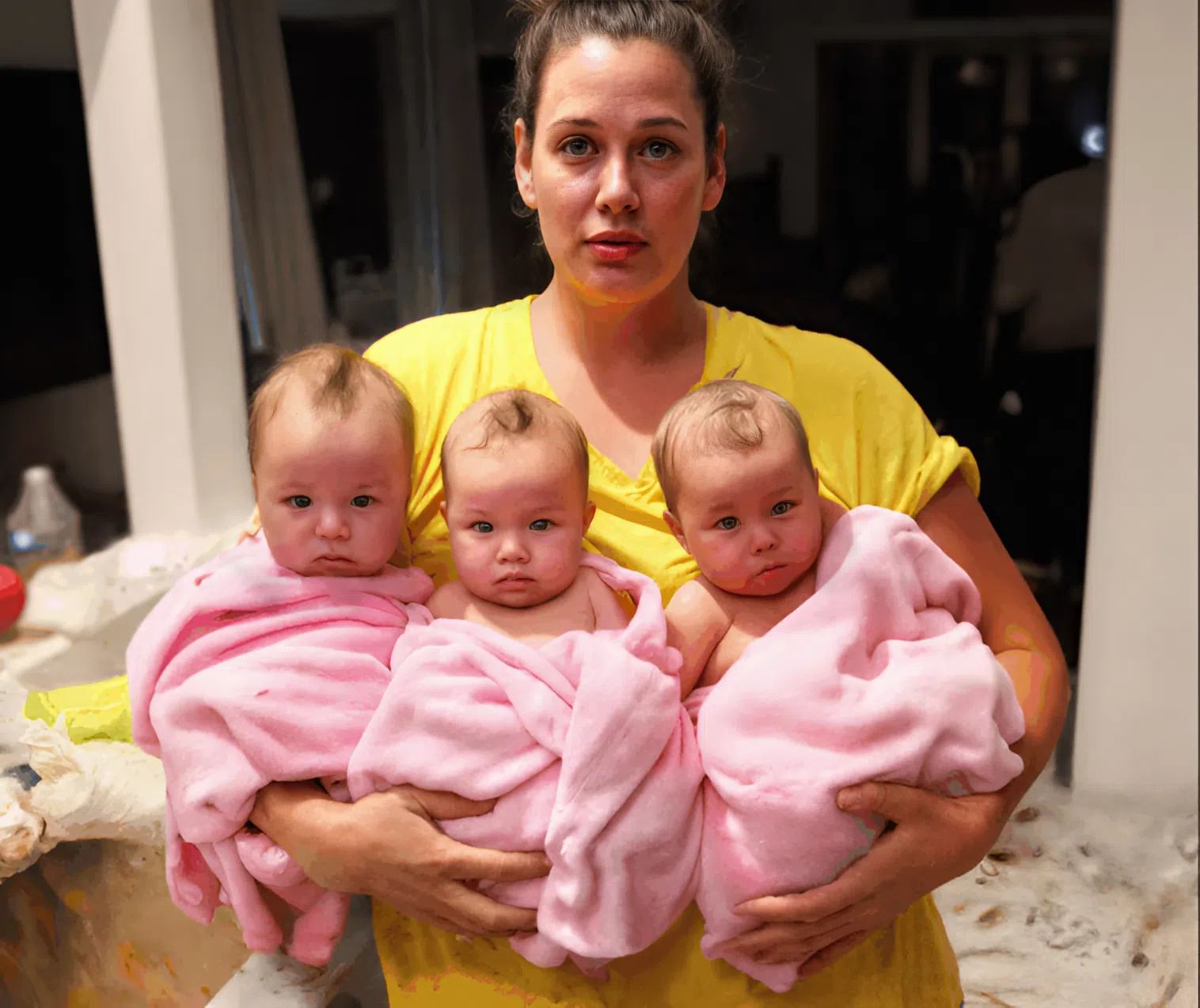 Nothing felt natural. My body ached everywhere. They needed more than I could give. I warmed bottles while holding two children at once — one on each thigh — while the third cried in his bouncer, as if he already understood that he would have to wait.