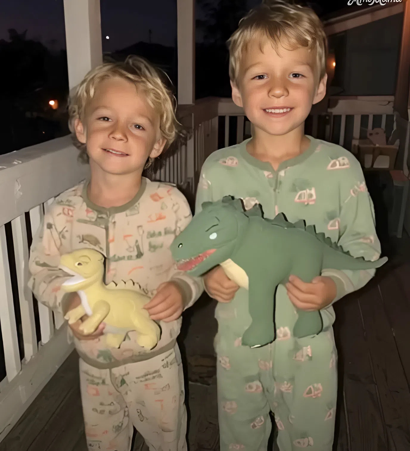 There stood Marcus and Tyler in their dinosaur pajamas, each clutching a stuffed toy. Marcus had his green T. rex; Tyler had his blue Triceratops. They looked half-asleep and confused.