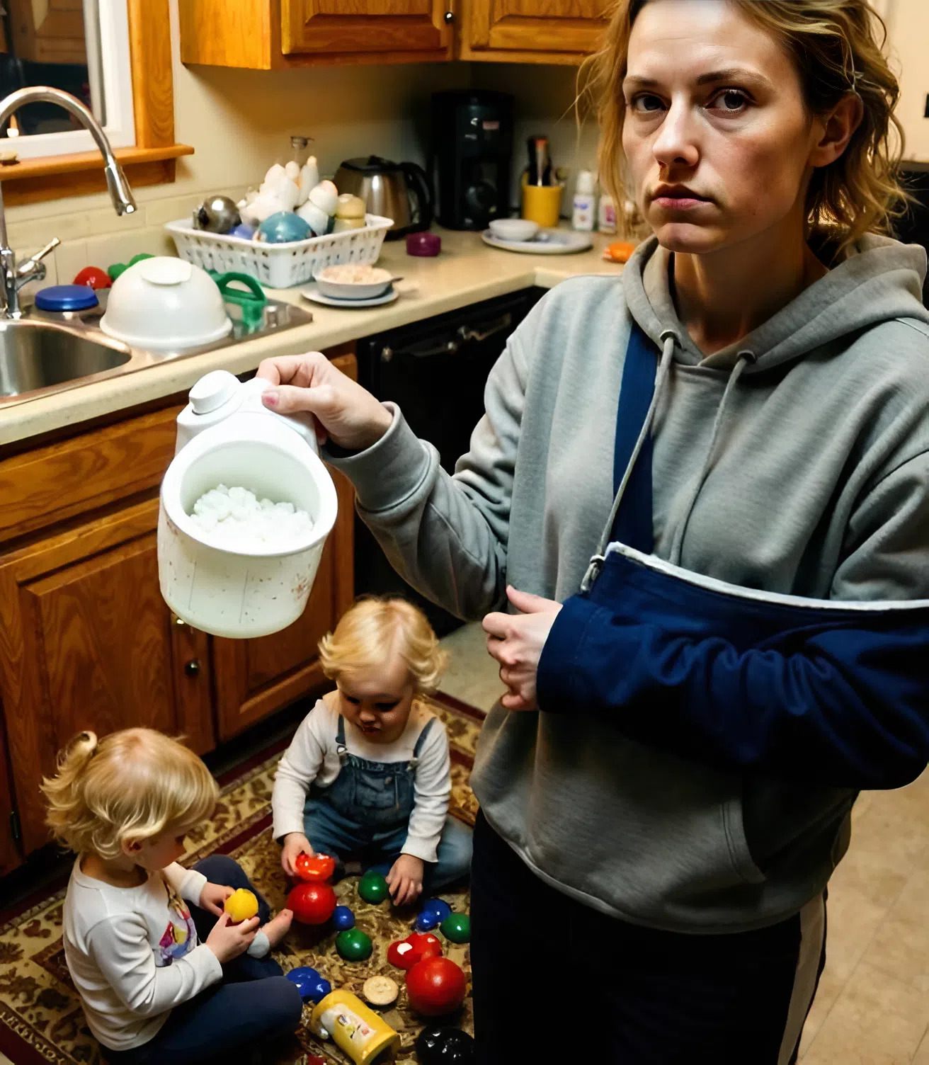She answered quietly, and what I saw made my blood boil. She was sitting on the floor, pale and exhausted, with both twins climbing on her.