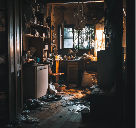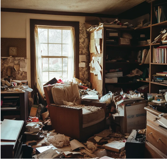 Shoes, newspapers and empty boxes littered the front door, and I had to squeeze my way inside. Every surface was covered with layers of random junk. I couldn’t tell where the living room ended, and I didn’t even know where to put my feet.