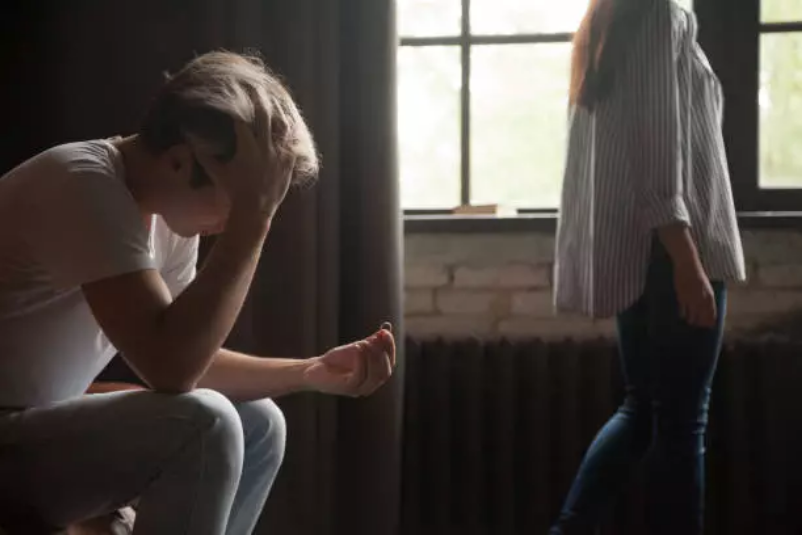 Young frustrated sad man holding wedding engagement ring, wife or girlfriend leaving depressed heartbroken husband, couple breaking up divorce concept, relationships breakup, proposal rejection