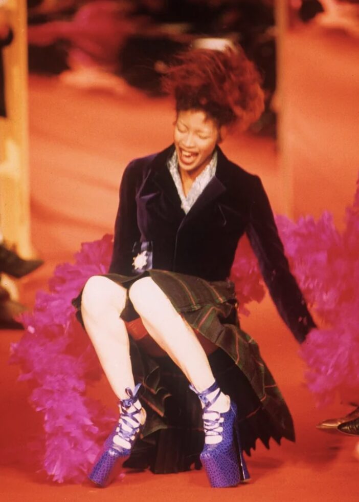 The most famous episode was the Vivienne Westwood show in 1993, when Naomi spectacularly collapsed on the catwalk from her 23-centimetre platforms. Instead of getting angry, she burst out laughing, turning an awkward moment into one of the most memorable scenes in fashion history.