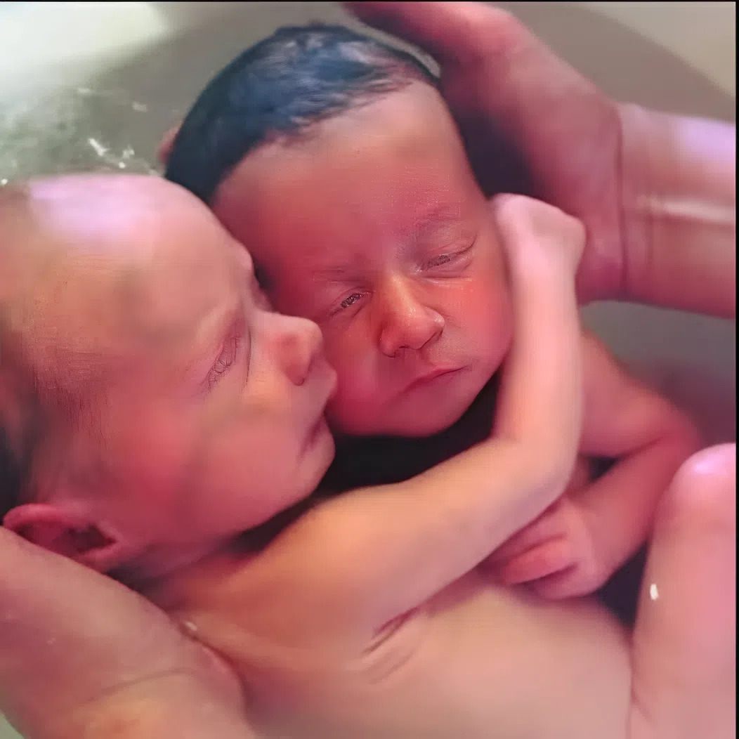 The twins are receiving a special baby bath, developed by Sonia Rochel, a maternity nurse and grandmother from Paris, France.