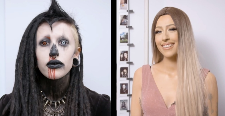 The final touch sealed the illusion. Erin was fitted with a light-colored wig and dressed in a bright pink, ultra-feminine outfit. Blonde hair, glowing skin, and glossy makeup erased any hint of her usual Gothic persona. She looked like someone straight out of a curated social media feed—almost unrecognizable.