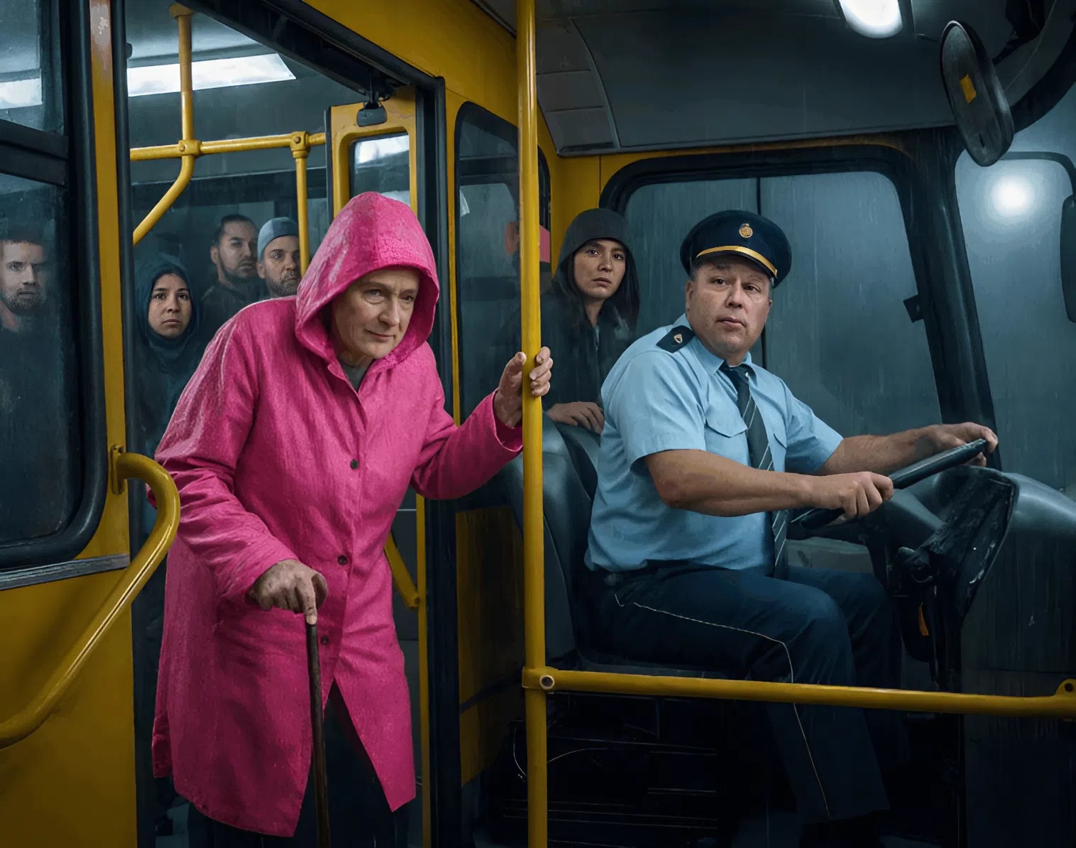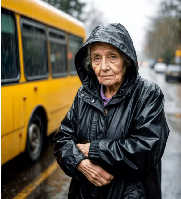 It was raining heavily that morning in Brookhaven. The yellow city bus screeched to a halt at the corner of Maple and Third Street, and the doors opened with a clatter. An elderly woman got on, her thin black coat soaked through. She slowly climbed the steps, holding onto the railing with her trembling, frail hands.