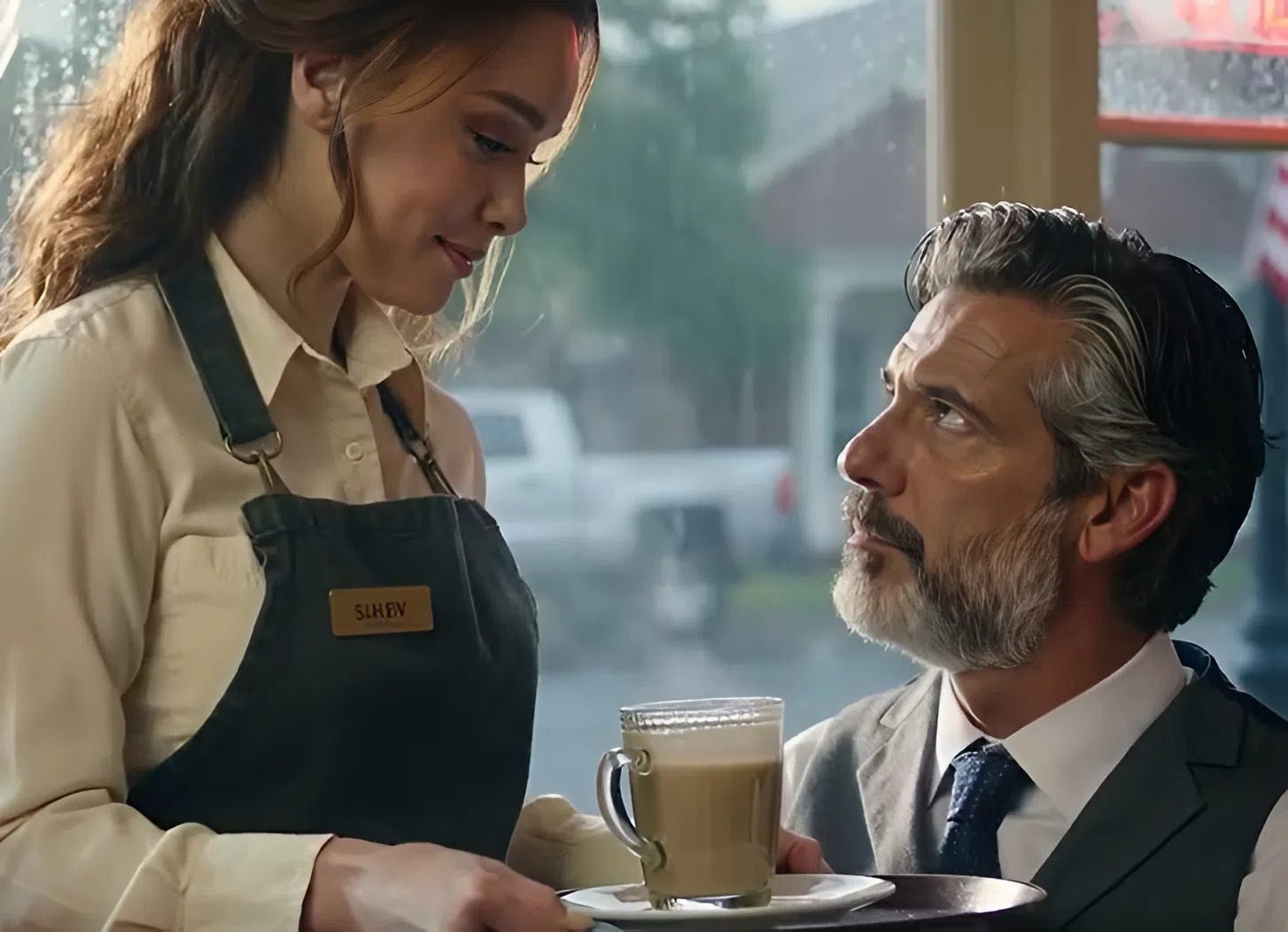 She didn’t look up immediately, but something had changed. The air froze, and curiosity pierced her. She glanced at the door. A tall man entered, dressed in a charcoal suit with a silk scarf, his grey hair neatly combed. His polished shoes tapped silently on the floor. He looked like a man who belonged in a glass tower, not in this modest café.