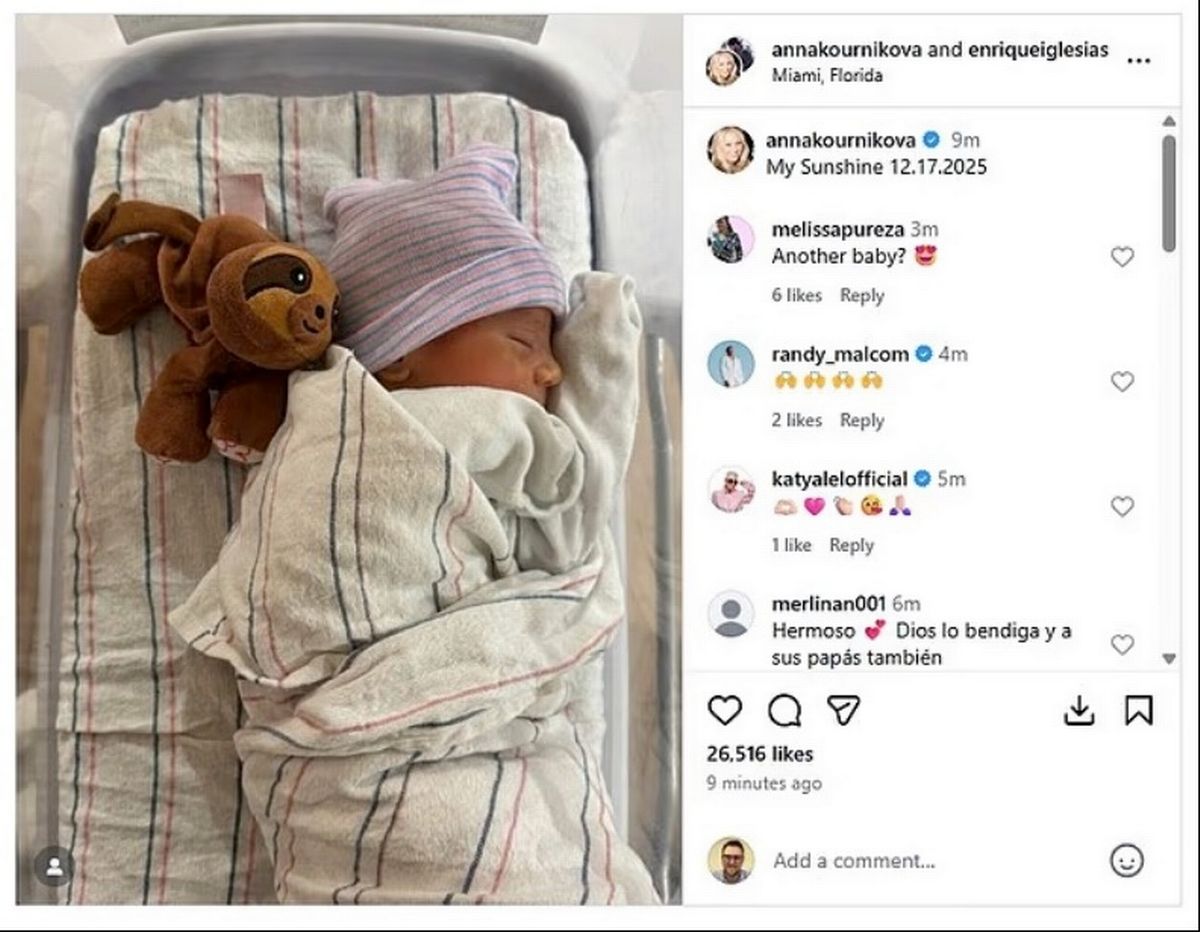 44-year-old Kournikova became a mother for the fourth time and released the first photo of her baby. Enrique and Anna showed their child’s face without covering it with an emoji, unlike other celebrity parents. Earlier, there were alarming rumours on the internet that Enrique was cheating on his wife.