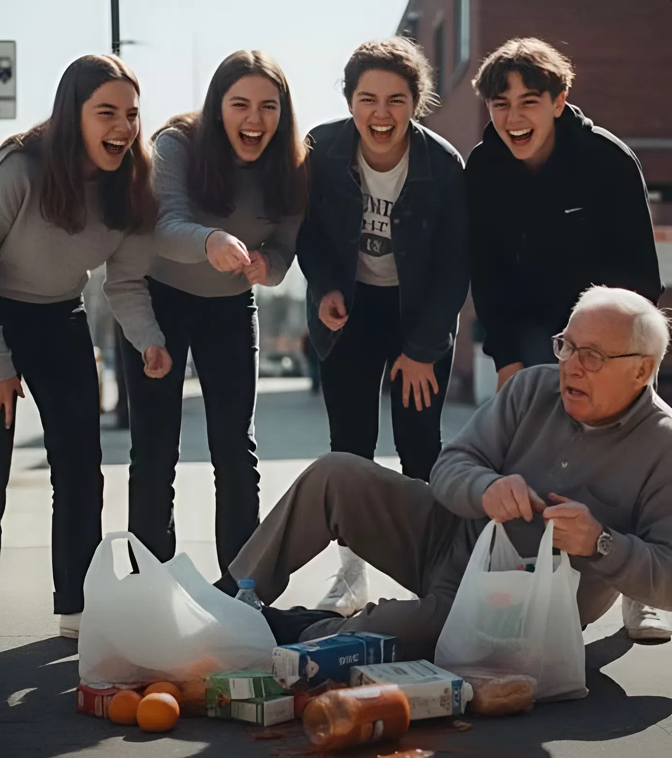 Four teenagers, maybe around seventeen, were standing nearby. They didn’t flinch. Didn’t step forward. They just laughed. One girl doubled over, slapping her knee. A boy pointed like he was watching a comedy act. The old man tried to get up, clearly shaken, but the laughter just went on.
