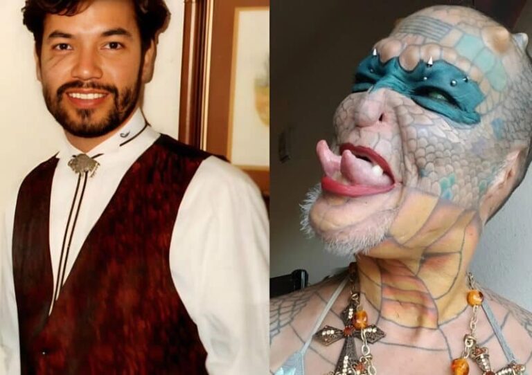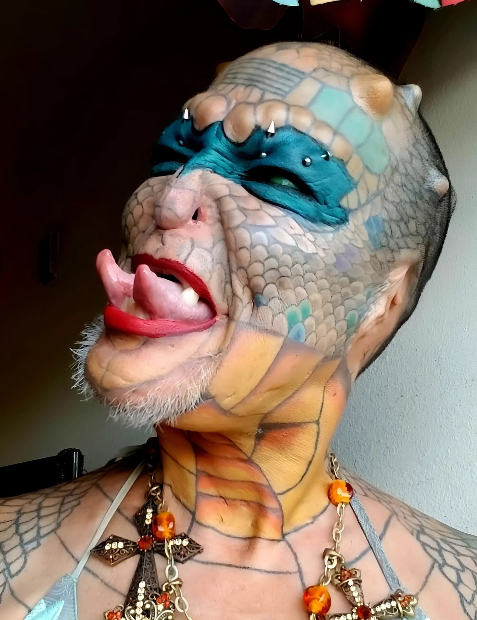 From that moment on, he began a gradual process of transforming himself into a ‘dragon man.’ He got tattoos on his face and body, stylised to look like reptilian scales, split his tongue to resemble a snake’s, and had horn implants installed on his forehead.