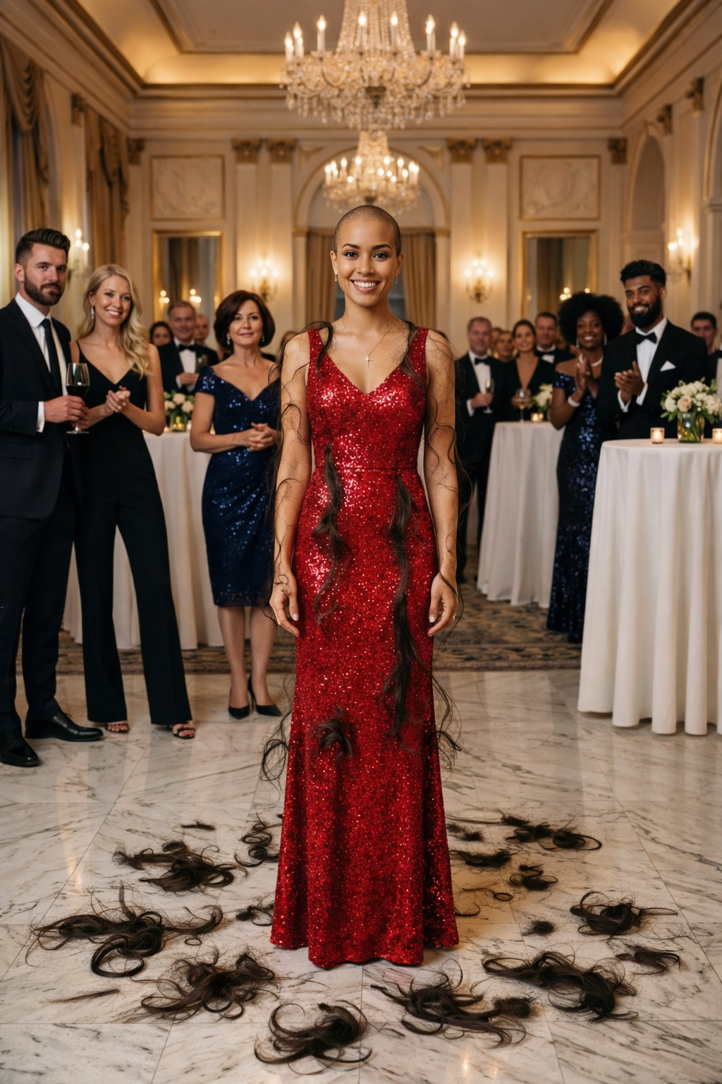 There was only music, the soft clink of glassware… and the quiet, unmistakable sound of my hair dropping around me.